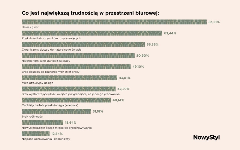 Istnieją czynniki, które w oczach respondentów podnoszą atrakcyjność przestrzeni biurowej, tak samo możemy wskazać na te, które stanowią największą trudność. Analiza wyników badań Nowego Stylu wskazuje na kluczowe wyzwania, z którymi musimy się zmierzyć, aby poprawić komfort i efektywność pracy. W dobie intensywnego rozwoju cyfryzacji i technologii, jesteśmy coraz bardziej narażeni na napływające informacje, co prowadzi do zwiększonego zmęczenia bodźcami. Hałas i gwar oraz zbyt duża ilość czynników rozpraszających to trudności, które mogą wskazywać na problem przebodźcowania. Co więcej, są to czynniki, które uzyskały najwyższe noty we wszystkich grupach wiekowych respondentów. Dodatkowe źródła hałasu i rozpraszające elementy stają się jeszcze bardziej drażniące, co może prowadzić do obniżenia efektywności i komfortu pracy. Ponadto, dynamiczny rozwój pracy hybrydowej i częściowe przeniesienie obowiązków zawodowych do domu spowodowały, że wiele osób odzwyczaiło się od intensywnej, głośnej atmosfery biurowej. To dodatkowo potęguje negatywne odczucia związane z hałasem i rozpraszaczami. W związku z tym teraz jeszcze ważniejsze staje się zadbanie o odpowiednią akustykę biura i doposażenie go w skuteczne rozwiązania – takie, jak panele dźwiękochłonne, które mogą znacząco poprawić komfort pracy i redukować niepożądane hałasy – mówi Bartosz Karasiński,